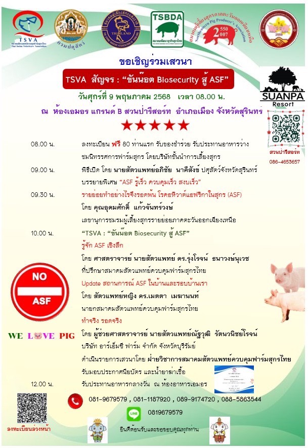 วันที่ 19 มีนาคม 2568 นายสัตวแพทย์อภิชัย นาคีสังข์ ปศุสัตว์จังหวัดสุรินทร์ พร้อมด้วย นายสัตวแพทย์ประยูร พรมไธสง นายสัตวแพทย์ชำนาญการพิเศษ หัวหน้ากลุ่มพัฒนาคุณภาพสินค้าปศุสัตว์ นายสัตวแพทย์จรูญวิทย์ นะพรรัมย์ นายสัตวแพทย์ชำนาญการพิเศษ หัวหน้ากลุ่มพัฒนาสุขภาพสัตว์ ร่วมหารือ และให้คำปรึกษาแก่สมาคมผู้เลี้ยงสุกรภาคตะวันออกเฉียงเหนือ ในการจัดงานเสวนา TSVA สัญจร “ขันน็อต Biosecurity สู้ ASF” แก่ผู้ประกอบการเลี้ยงสุกรโดยเฉพาะเกษตรกรรายย่อยทำอย่างไรจึงรอดพ้นโรคอหิวาห์แอฟริกาในสุกร(ASF) ซึ่งกำหนดจัดขึ้นในวันศุกร์ที่ 9 พฤษภาคม 2568 ณ ห้องเอมอร แกรนด์ B สวนป่ารีสอร์ท อำเภอเมืองสุรินทร์ จังหวัดสุรินทร์ พร้อมนี้ทางสมาคม