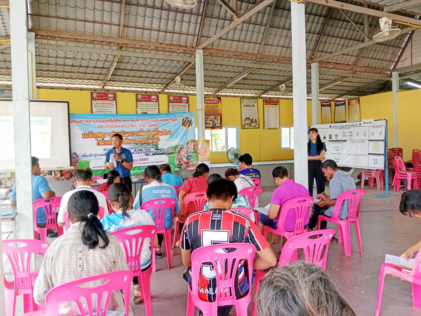 วันที่ 21 เมษายน 2568 น.สพ.อภิชัย นาคีสังข์ ปศุสัตว์จังหวัดสุรินทร์ มอบหมายให้ นายศรัณวัชร์ บุญเกิด หัวหน้ากลุ่มยุทธศาสตร์และสารสนเทศการปศุสัตว์ พร้อมด้วยนายประพันธ์ โพธิ์เงิน ปศุสัตว์อำเภอโนนนารายณ์ พร้อมด้วยเจ้าหน้าที่กลุ่มยุทธศาสตร์ฯ และเจ้าหน้าที่ปศุสัตว์อำเภอโนนนารายณ์ ร่วมจัดโครงการส่งเสริมและพัฒนาเกษตรอินทรีย์อย่างครบวงจร กิจกรรมฝึกอบรมหลักสูตร ส่งเสริมการเลี้ยงไก่พื้นเมือง เพื่อสร้างอาชีพ สร้างรายได้ เพื่อส่งเสริมพัฒนาการเลี้ยงไก่พื้นเมืองของเกษตรกรให้เข้าสู่การเลี้ยงไก่พื้น เมืองที่มีระบบป้องกันโรคและการเลี้ยงสัตว์ที่เหมาะสม (Good farming management : GFM) พร้อมทั้งส่งเสริมและขับเคลื่อนให้เกษตรกรเลี้ยงไก่พื้นเมืองในรูปแบบต่างๆ ที่เหมาะสมกับพื้นที่ ลดต้นทุนการผลิต เพื่อให้สามารถผลิตไก่พื้นเมืองให้ตรงตามความต้องการของตลาดทั้งในและต่างประเทศได้ โดยจัดอบรม ณ ศาลาประชาคมบ้านโนนน้อย หมู่ 6 ตำบลระเวียง อำเภอโนนนารายณ์ จังหวัดสุรินทร์ มีเกษตรกรเข้าร่วมอบรมทั้งสิ้น 20 ราย