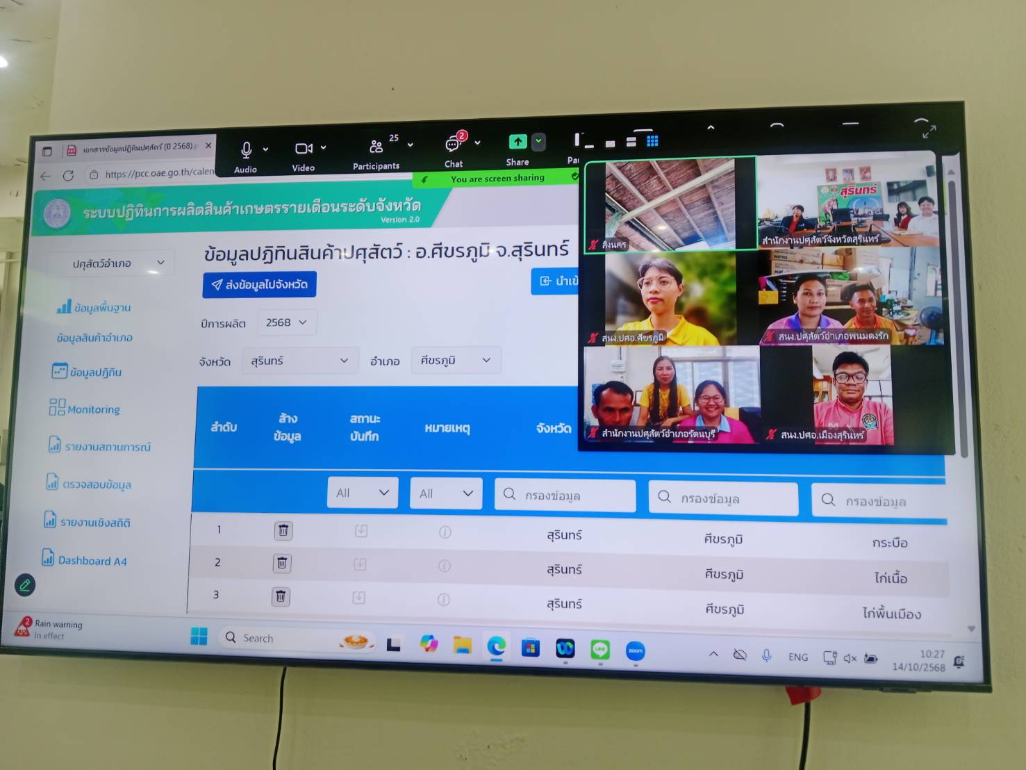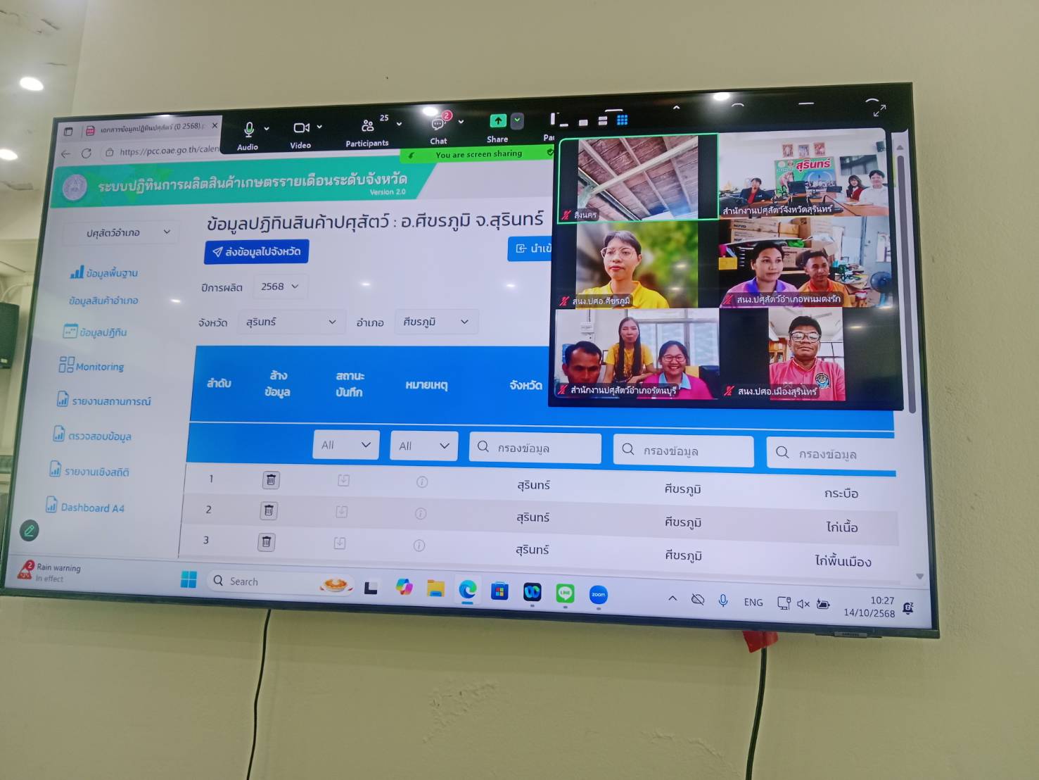 วันที่ 14 ตุลาคม 2568 เวลา 09.30 น. น.สพ.อภิชัย นาคีสังข์ ปศุสัตว์จังหวัดสุรินทร์ มอบหมายให้ นายศรัณวัชร์ บุญเกิด หัวหน้ากลุ่มยุทธศาสตร์และสารสนเทศการปศุสัตว์ ดำเนินการประชุมการจัดทำปฏิทินผลผลิตสินค้าเกษตรรายเดือนระดับอำเภอ/ระดับจังหวัด เพื่อการบริหารจัดการด้านความมั่นคงอาหารและโภชนาการ ประจำปี 2568โดยนำเข้าข้อมูลในระบบ (ด้านปศุสัตว์) ให้แล้วเสร็จ ภายในวันที่ 24 ตุลาคม 2568 ผ่านระบบประชุมทางไกลออนไลน์ Zoom Conference Meeting โดยมีนางอิศราภรณ์ ตีทอง เจ้าพนักงานสัตวบาล และนางสาวกนกอร พันทอง นักวิชาการสัตวบาล ชี้แจงในการนำเข้าข้อมูลระบบปฏิทินผลผลิตสินค้าเกษตรรายเดือนด้านปศุสัตว์ ณ ห้องประชุมสำนักงานปศุสัตว์จังหวัดสุรินทร์ ซึ่งเจ้าหน้าที่ปศุสัตว์อำเภอให้ความร่วมมือเป็นอย่างดีในการจัดทำนำเข้าข้อมูล